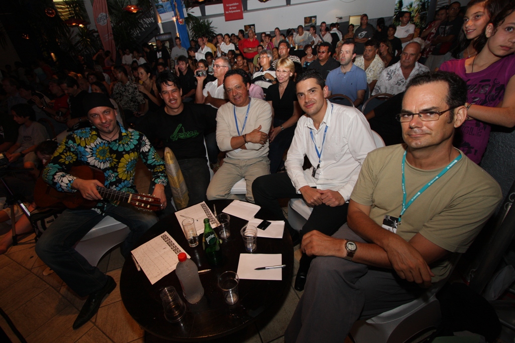C’est fini, déjà, les feux de la rampe se sont éteints samedi vers 1 heure du matin. Nous, les organisateurs, sommes ravis, mais épuisés… La foule était au rendez-vous, près de 2000 spectateurs sur les deux soirées, et sur scène des artistes, des grands de la guitare qui nous ont offert un superbe spectacle, inoubliable. Des images, de la musique plein la tête, de la bonne humeur, une parfaite convivialité tant sur scène que dans les salles et la pelouse du Méridien. Solo a déjà repris l’avion, direction Paris, puis Montréal. Xavier (notre ingé-son breton), Eric, Christofe, Yohann, Steve, Hans, David, Richard & Jean Jacques vont profiter encore quelques jours de nos plages et de l’accueil du Méridien Tahiti. Merci à tous, partenaires, prestataires, médias, artistes, public et longue vie au Tahiti Festival Guitare !