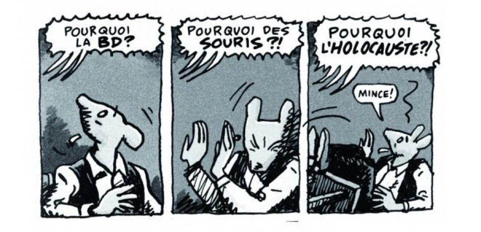 « Des portes d’Auschwitz aux trottoirs de New York, « Maus » se déroule, en deux temps (les années 1940 et les années 1970), le récit d’une double survie : celle de son père, mais aussi celle du fils qui se débat pour survivre au survivant. Une transposition systématique des personnages dans un univers animalier est une des caractéristiques marquantes de l’œuvre : outre les nazis représentés par des chats et les Juifs par des souris, les Polonais sont des cochons, les Américains des chiens et les Français des grenouilles (Wikipedia). »