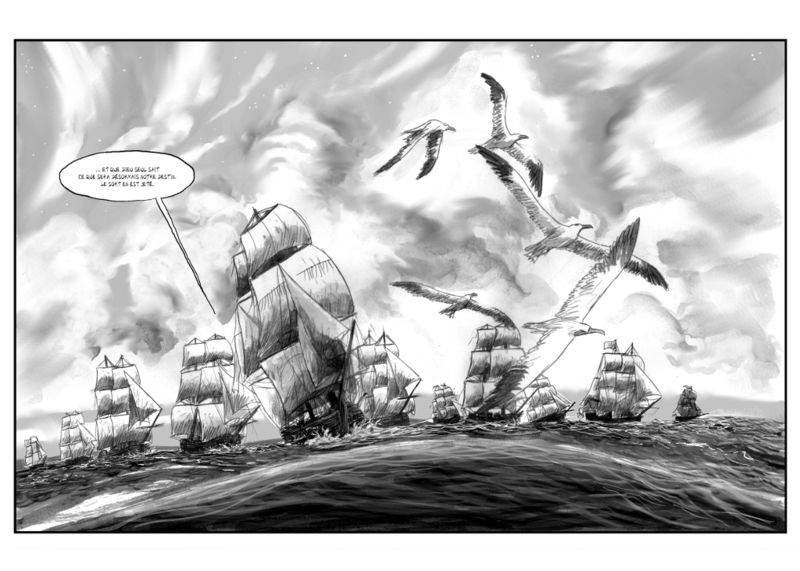 Voilà un roman graphique que l’on n’oublie pas. Le récit ne nous présente pas une épopée menée par d’incroyables marins, qui pour la couronne d’Angleterre, sont près à en découdre avec les éléments et la racaille londonienne condamnée à l’exil. Non, Terra Australis, nous parle d’hommes et de femmes qui se retrouvent, souvent contre leur gré, pris dans un incroyable aventure. Qu’il s’agisse des bagnards (Caesar, Betsy, John,… ), de l’équipage, des militaires (Clark, Tench, Ross,…), des chefs d’expédition (Phillip, Lapérouze), du voyageur (Smith), des aborigènes (Bennelong), le livre nous raconte leur histoire, des morceaux de vie qui juxtaposés les uns aux autres donnent ce magnifique récit, parfois sombre, parfois teintée d’espoirs. Les protagonistes de ce récit rencontre d’autres histoires, celle de l’indépendance des Etats-Unis, celle de la colonisation, celle de l’esclavage, celle des éternels conflits entre Français et Anglais et les prémices de la révolution française. Les dessins en noir et blanc de Nicloux sont aussi pour beaucoup dans la réussite de cette bande dessinée, car ils créent les ambiances, assombrissent les destins, donnent le mouvement sur l’océan, rendent parfaitement l’atmosphère pesante d’un tel voyage. Une pensée particulière au kangourou de l’histoire qui était finalement le premier à fouler cette Terre Australis, bien avant l’arrivée des hommes.
