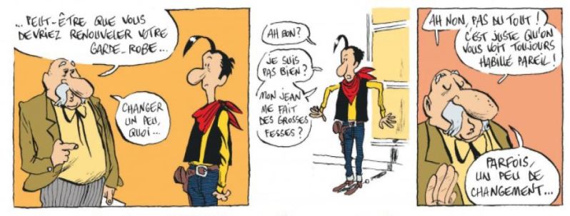 Marc – A lire le résumé on pourrait croire à une nouvelle aventure du cowboy solitaire, mais l’exercice est tout autre et Bouzard nous emmène dans un univers parallèle. Dans cet univers, Lucky Luke n’est que l’ombre de lui même, personne d’ailleurs ne le reconnaît, pas même son cheval. Et pourtant c’est bien lui, un peu dépressif, qui s’en va sortir les Dalton de prison. Et oui, univers parallèle, mais avec son lot de jeux de mots goscinnièsques (j’adore tout particulièrement le barbier de Séville Gulch !) et des vilains très vilains, quoi que ! L’histoire a peu d’importance, les dialogues sont excellents, les running gags fonctionnent à merveille, Averell ressemble enfin à son estomac ! Un bémol, c’est un peu court, j’en aurait bien pris une louche supplémentaire.