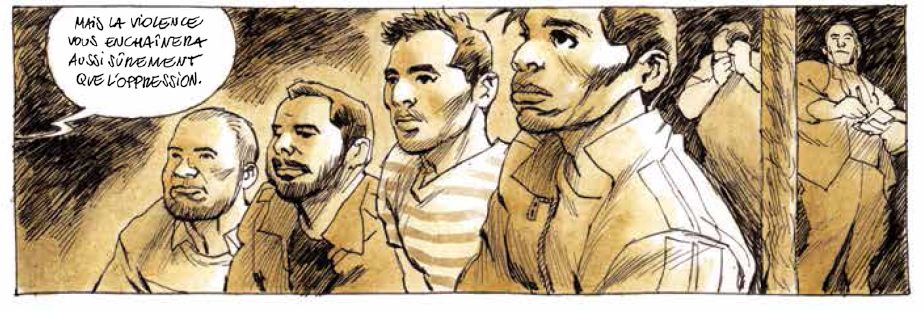 Une BD très étonnante, tout d’abord parce qu’elle laisse la parole à ceux du dedans, il y a bien une narration, mais elle est légère, presque invisible. C’est de la BD documentaire, sans prendre partie, nous découvrons ce quartier, le quotidien de ses habitants, la vie sous « Bachar », sous la dictature, avec ses barons, sa corruption, ses arrestations sommaires, sans liberté d’opinion mais également sans bombe. L’histoire nous raconte comment les membres d’une famille ordinaire, sympathisants de mouvements contestataires pacifiques, vont peu à peu, du fait de la répression du régime, glisser vers la lutte armée, s’engager auprès de factions armées voulant chasser du pouvoir le dictateur. C’est un engrenage bien huilé, le discours se radicalise, les civils sont les premiers à payer, et la guerre civile contamine tout le monde. Tout s’embrase.