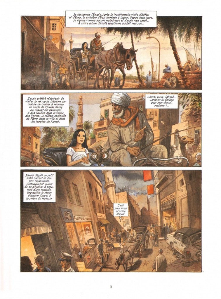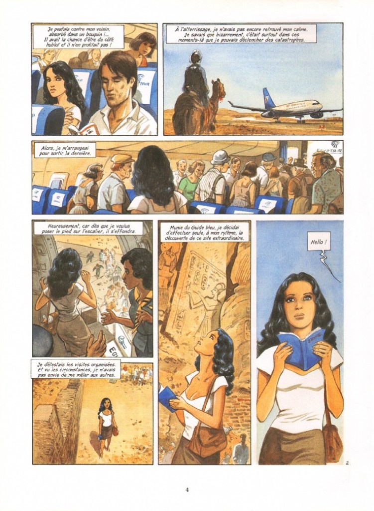 Maryse & Jean-François Charles est prenante, nous fait visiter l’Égypte et ses sites anciens, tout en nous racontant la double histoire d’une jeune femme d’aujourd’hui et d’une princesse égyptienne oubliée, sans nom. Il s’agit d’une série chorale, à plusieurs mains. L’histoire contemporaine est illustrée par Jean-François Charles dont les dessins à l’aquarelle ont un charme et un romantisme certain qui sied très bien l’histoire. Les évocations historiques sont dessinées par d’autres dessinateurs (André Taymans (I), Francis Carin (II), Brice Goepfert (III), Christophe Simon (IV) ), ce qui permet aisément de quitter une époque pour une autre. La lecture est aisée et on y trouve un réel plaisir, la magie de l’Egypte ancienne fascine toujours autant. Plaisir redoublé, lorsque je redécouvrais des lieux que j’avais visités lorsque j’étais étudiant : Le Caire, la vallée des rois, Luxor, Abou Simbel, le désert arabique, le Canal de Suez, le Sinaï et Sainte Catherine, le petit guide bleu en poche, celui que Ella feuillette en page 4 du premier tome.