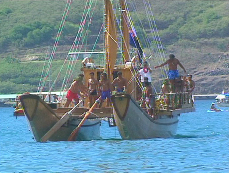 Hawaii est en vue, le temps est maussade mais le vent aide à la progression des pirogues. Pourtant, elles sont stoppées dans leur élan par les services phytosanitaires américains qui craignent que les embarcations ne soient porteuses de larves d’insectes nuisibles. Les médias s’emparent de l’affaire, tout rentre rapidement dans l’ordre.