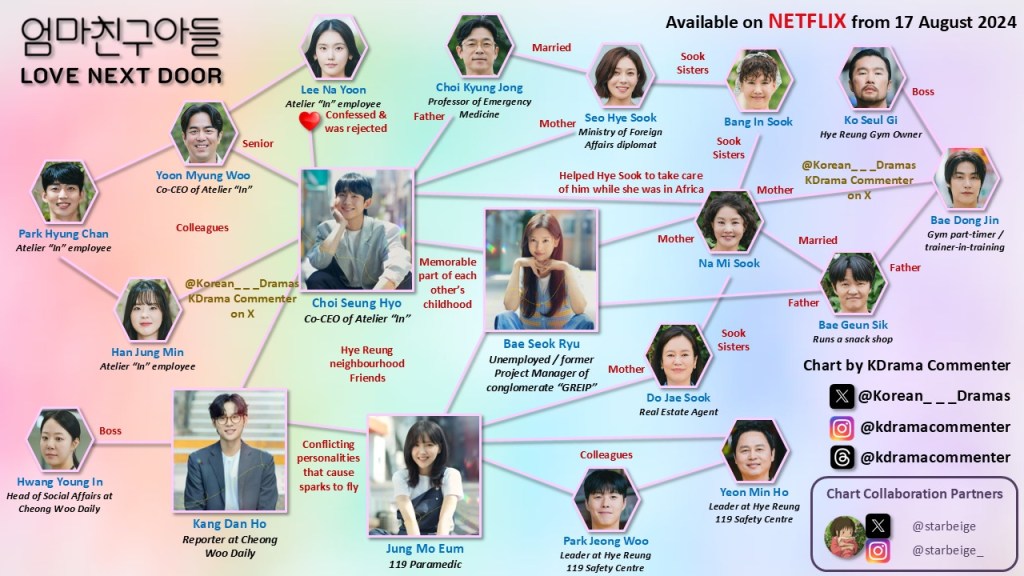 L’arc de leur relation dans Love Next Door est construit sur des avancées progressives et des moments de recul. Chaque évolution de l’un des personnages pousse l’autre à remettre en question ses propres comportements et émotions, créant un effet de miroir qui approfondit leur relation. Le récit met en lumière l’importance de surmonter les peurs, d’accepter sa propre vulnérabilité et de laisser le passé derrière soi pour construire un avenir commun.