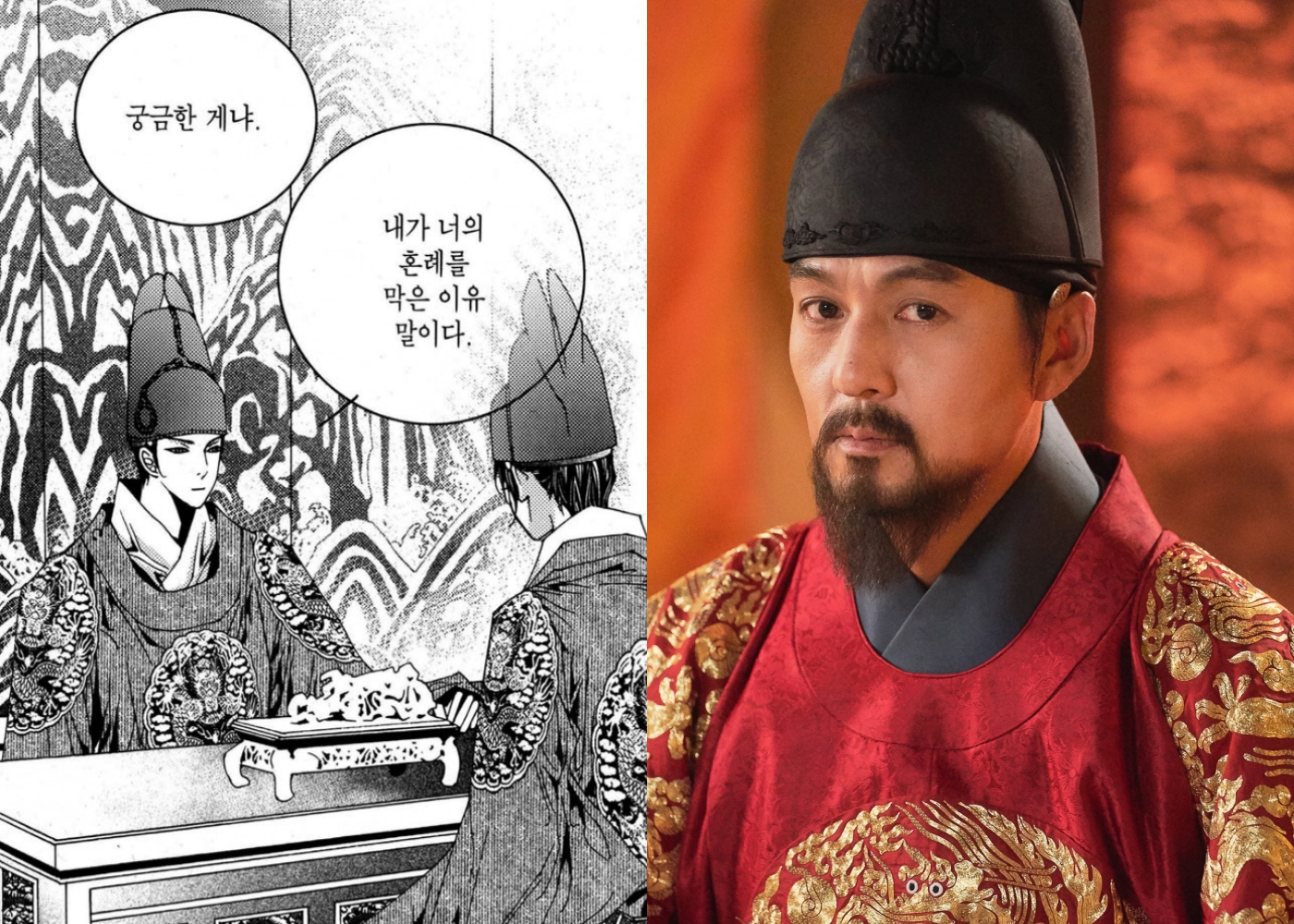 De plus, la position du roi varie entre les deux versions. Dans le webtoon, le roi Hyejong tombe malade et décède, proclamant Lee Hwi comme successeur avant sa mort. Dans la série, le roi Hyejong reste en vie pendant une grande partie de l’intrigue, bien que souffrant d’une maladie, ce qui modifie la dynamique politique et familiale présentée.