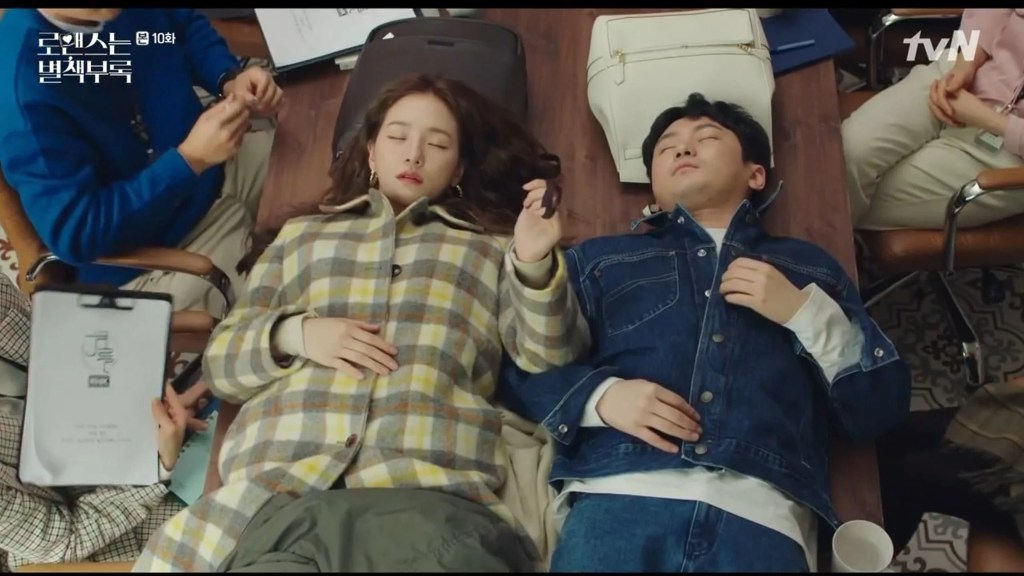 En arrière-plan, la série égrène d’autres romances secondaires, parfois légères, parfois simplement esquissées. Le duo Park Hoon et Oh Ji-yool apporte de la fraîcheur dans un univers où les relations principales sont plus lentes et émotionnelles. Ils symbolisent l’élan amoureux de la jeunesse, avec ses maladresses, ses hésitations, ses jeux de séduction. D’autres personnages, comme Seo Young-ah et Bong Ji-hong, le couple marié de l’équipe, illustrent une forme d’amour du quotidien, entre complicité et épuisement, entre tendresse banale et soutien constant.