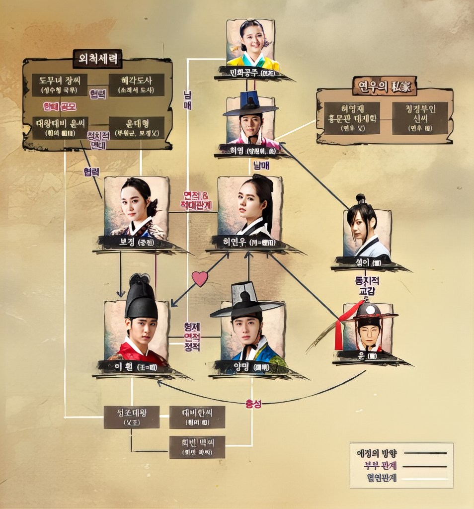 Autour de la romance contrariée de Lee Hwon et Yeon-woo gravite une galerie de personnages dont les destins se croisent dans un jeu complexe de loyautés, de jalousies et de rivalités. Bo-kyung, fille du puissant clan Yoon, est mariée au roi après l’éviction de Yeon-woo. Son union, pourtant conforme aux ambitions de sa famille, reste marquée par la frustration et la solitude : elle sait qu’elle ne possédera jamais le cœur de son époux. Sa jalousie croît face à l’ombre persistante de Yeon-woo et devient un élément moteur des tensions, révélant la cruauté d’un mariage politique imposé où l’amour n’a pas de place.