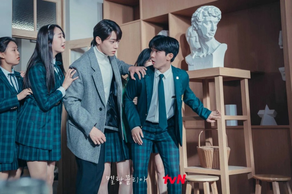 Melancholia se déroule principalement autour de l’école secondaire privée Ahseong, une institution prestigieuse au cœur de Gangnam, symbole de réussite sociale et scolaire, mais aussi d’un système corrompu où les privilèges et les manipulations règnent en maître. Les parents influents y dictent leur loi, plaçant leurs enfants dans une compétition féroce où le statut et l’apparence comptent plus que l’intégrité, et où la triche ou les arrangements opaques façonnent les notations, les entrées et les opportunités.