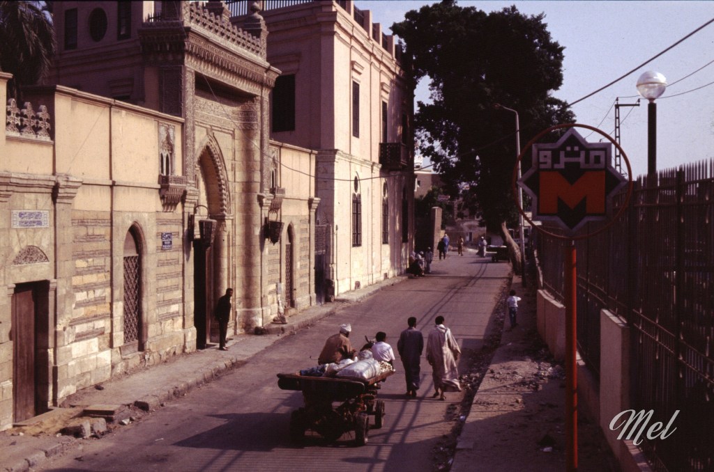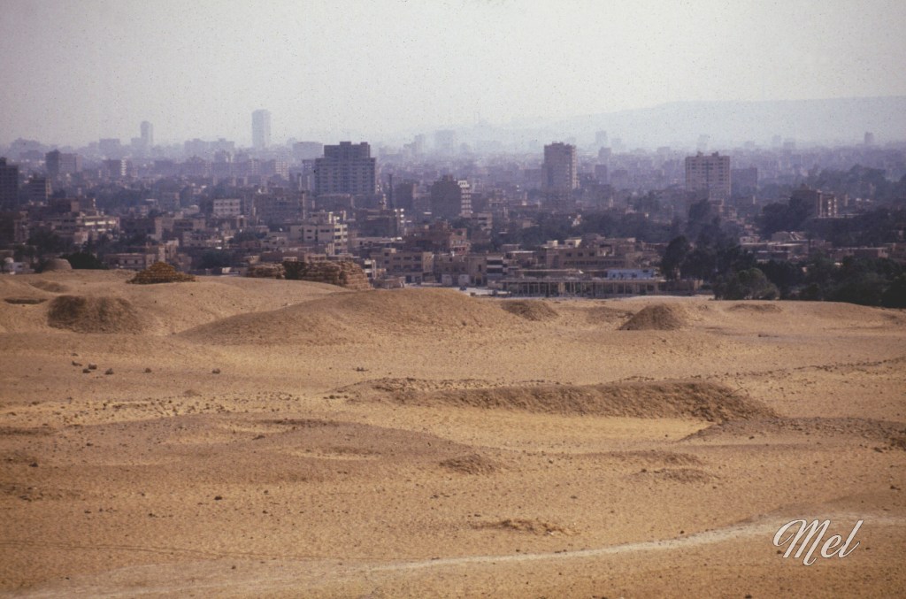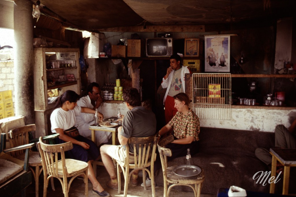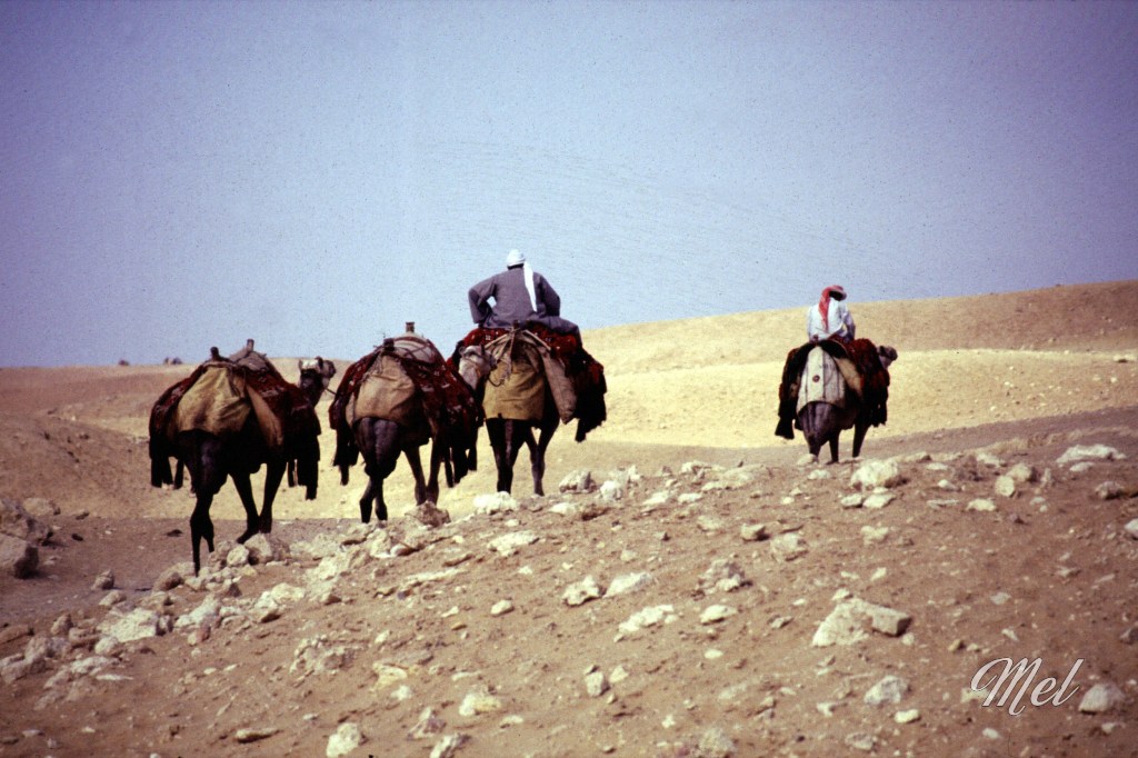 À l’aéroport du Caire, le choc fut immédiat. Des gardes armés de kalachnikovs attendent les passagers et séparent les passagers en deux files distinctes, les touristes d’un côté, les Égyptiens de l’autre. Valérie cherchait son passeport et était derrière nous. Lorsqu’elle arriva devant les gardes, ceux-ci l’orientèrent sans hésiter vers la file des Égyptiens, sa peau mat sans doute. Devant, nous ne nous rendions compte de rien. Elle proteste, tente d’expliquer, en vain. Finalement, elle trouve son passeport, le met devant son visage et lance à pleine voix « French, French ! ». Le malentendu se dissipe et elle nous rejoint, encore un peu secouée par la séquence.