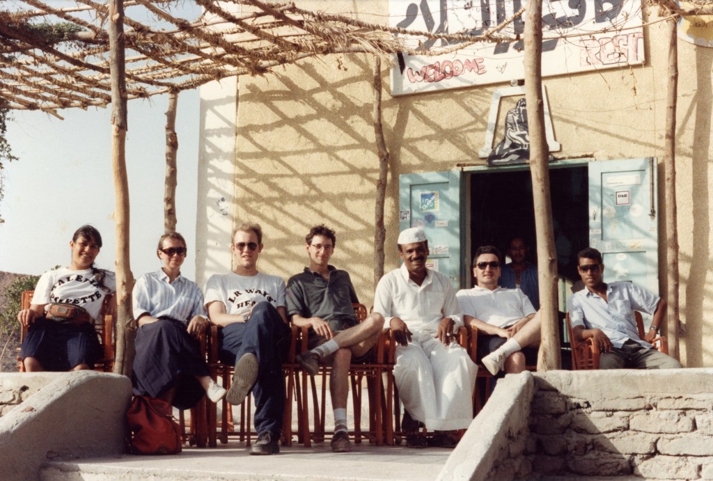 Nous étions cinq à partir pour ce voyage en Égypte. Comme souvent quand on est étudiant ou tout juste entré dans la vie active, nous avions envie d’un départ fondateur, d’un voyage qui marque durablement, loin de la famille, loin des habitudes, uniquement entre amis. L’Égypte s’est imposée presque naturellement. C’était un pays qui nous fascinait tous, chargé d’une histoire antique monumentale, à la fois mystérieuse et majestueuse. Valérie avait peint une immense fresque égyptienne sur les murs de son lycée à Tahiti, et pour ma part j’avais grandi avec les aventures de Papyrus et Théti-Chéri, ce qui nourrissait depuis longtemps mon imaginaire.